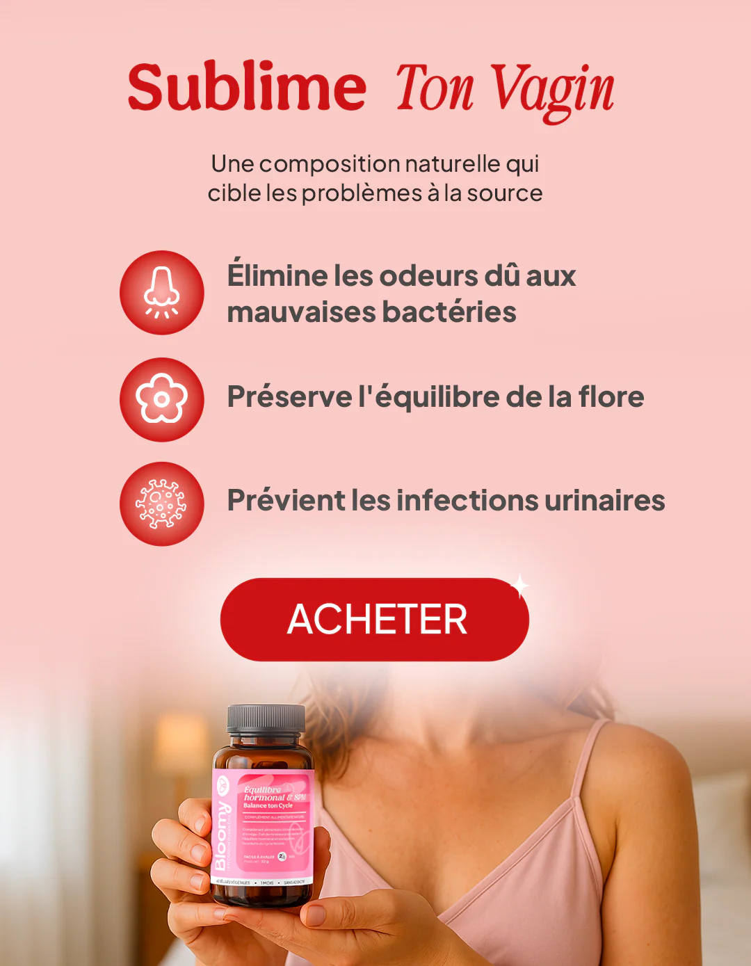 Ce complément offre une action complète : il aide à rééquilibrer les hormones, soutient une flore intime saine, diminue les odeurs vaginales gênantes et contribue à un cycle plus stable et plus confortable.