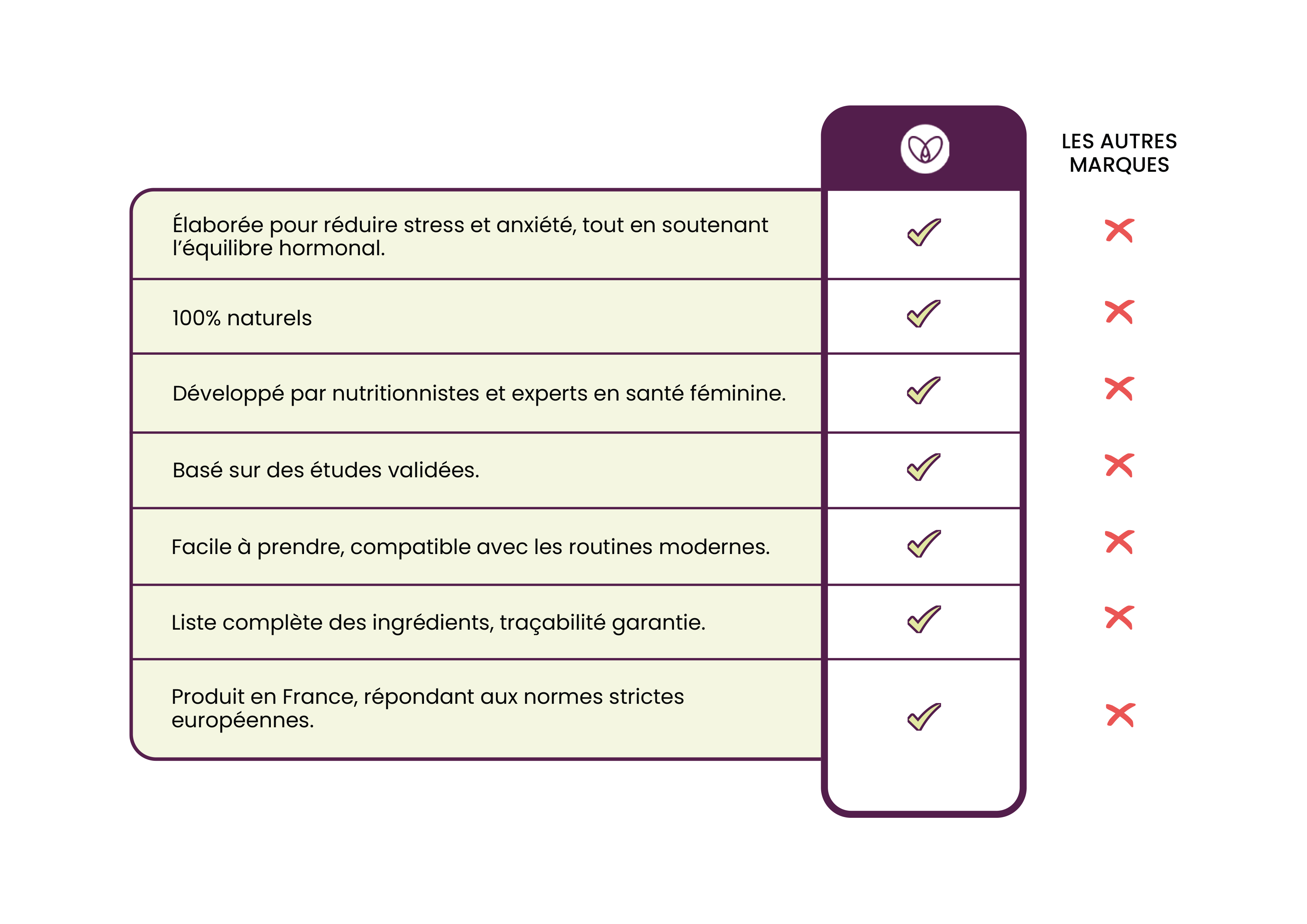 FormulĂ© avec lâexpertise de nutritionnistes, naturopathes et pharmaciens, notre complĂ©ment respecte les normes europĂ©ennes et offre un soutien naturel et efficace pour lâĂ©quilibre hormonal et le bien-ĂȘtre Ă©motionnel.